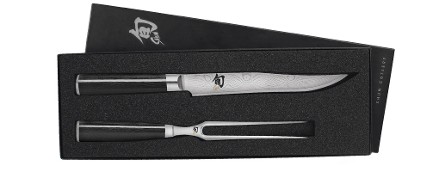 | The Shun Classic 2-Piece Carving set includes the 8-in. Carving Knife and Carving Fork in a boxed gift set. Whether you regularly carve for presentation or you simply want to provide a beautiful holiday table for friends and family, you'll be able to achieve beautiful, even slices every time with these elegant culinary tools. |